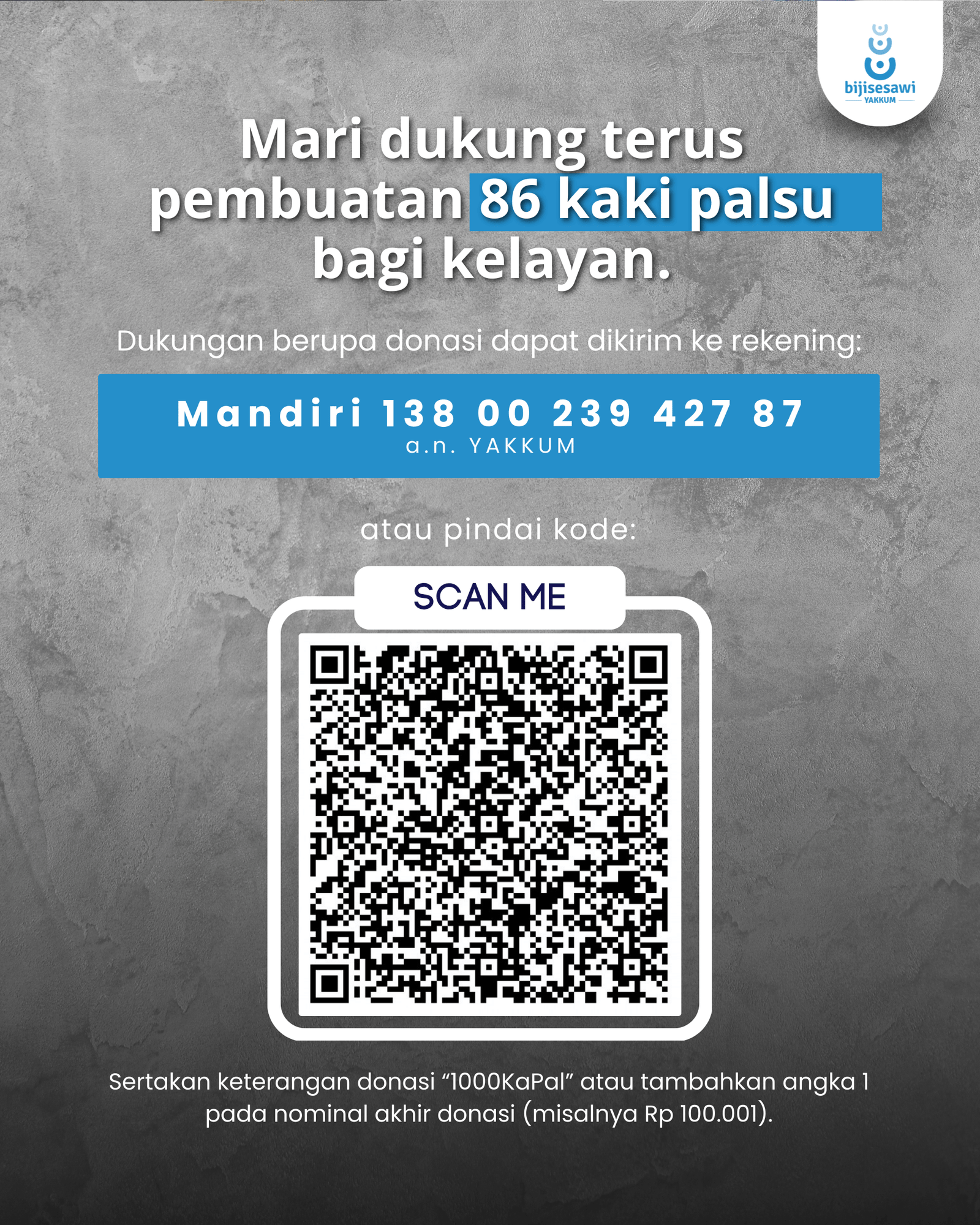 Mari bantu mereka miliki kaki palsu untuk menyusur jalan, menuju hidup yang makin berarti dengan donasikan sebagian rejeki kita melalui rekening Bank Mandiri: